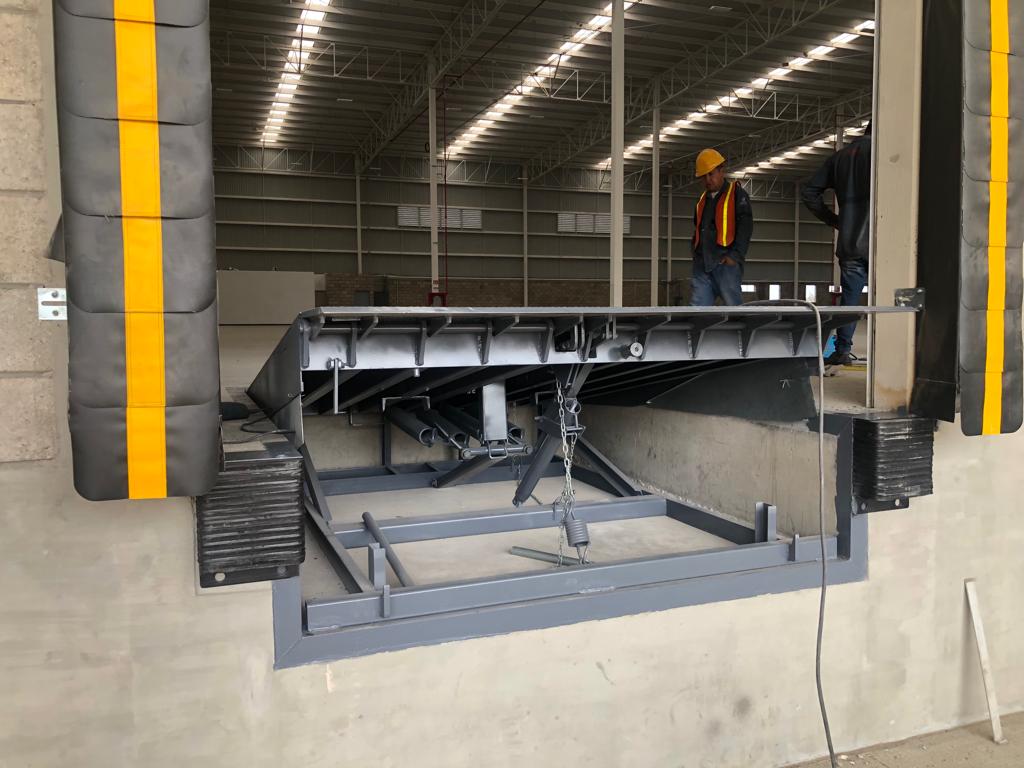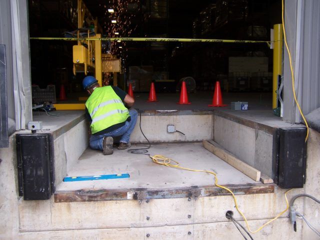 Una cavidad empotrada en el piso del edificio que acomoda la rampa niveladora de andén. Los cajones están revestidos a lo largo de los bordes con ángulos de acero estructural que están incrustados en el concreto.