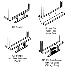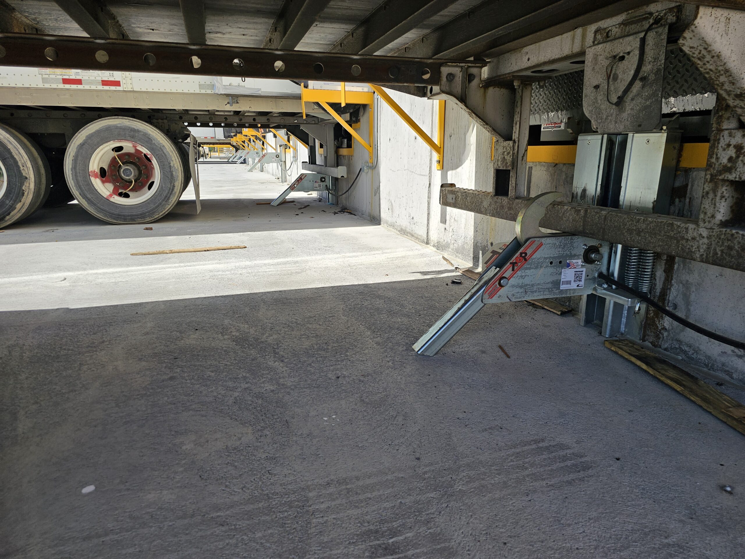 | Defensa trasera de camión diseñada para evitar que vehículos más pequeños se deslicen debajo de camiones y remolques en caso de una colisión trasera. Algunos retenedores de andén se acoplan al RIG (barra antiempotramiento trasera) para asegurar el camión y prevenir movimientos inesperados durante la carga y descarga. |